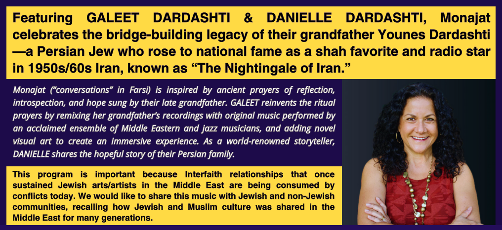 Vocalist/composer and anthropologist, GALEET DARDASHTI, is a trail-blazing performer and advocate for Middle Eastern Jewish culture. TONY has described Dardashti’s music as “urgent, heartfelt and hypnotic;” The Huffington Post called it “heart-stopping.” She is currently a Fellow at UPenn.