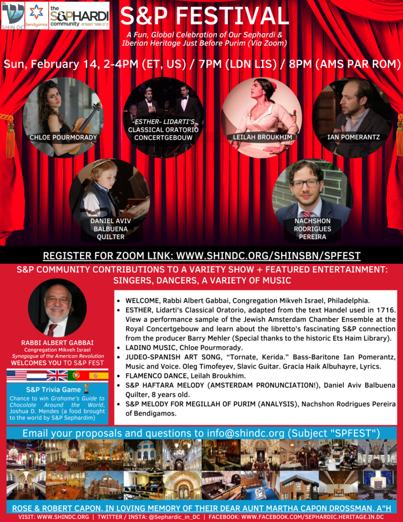 - ESTHER, Lidarti’s Classical Oratorio, adapted from the text Handel used in 1716. View a performance sample of the Jewish Amsterdam Chamber Ensemble at the Royal Concertgebouw and learn about the libretto’s fascinating S&P connection from the producer. (Special thanks to the Ets Haim Library).