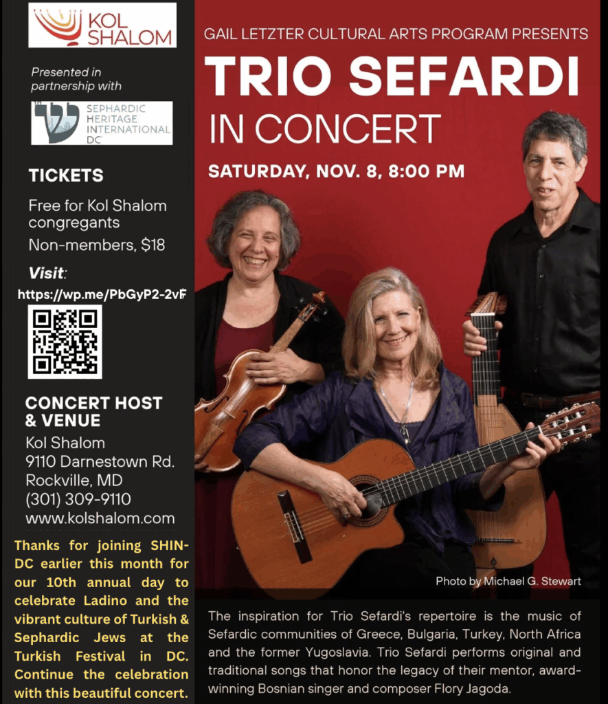 Trio Sefardi Ladino Concert at Kol Shalom in MD, Saturday, November 8, 8PM (ET)